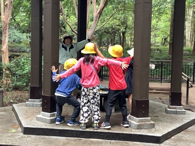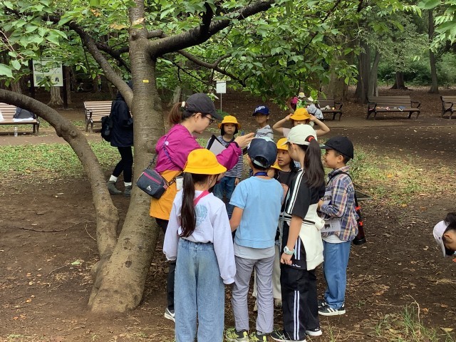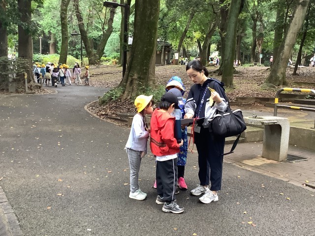 林試の森公園では、まず、異学年のグループで、オリエンテーリングを行いました。各ポイントでは、体を使った大きなジャンケンをしたり、協力してクイズに答えたりしました。