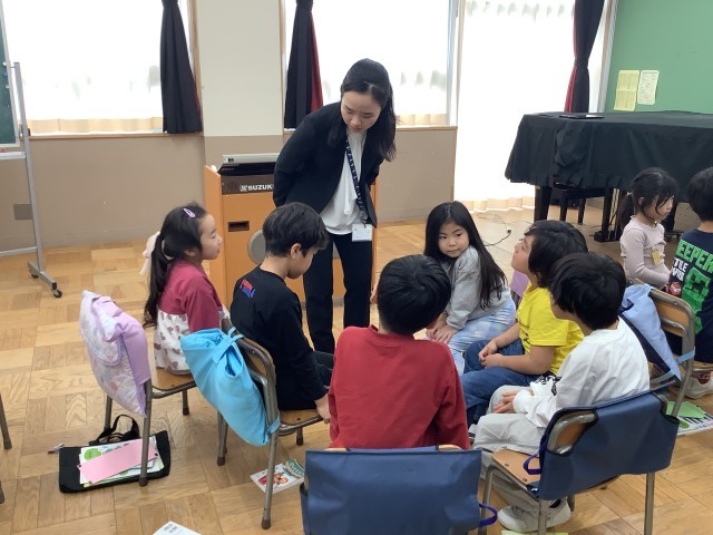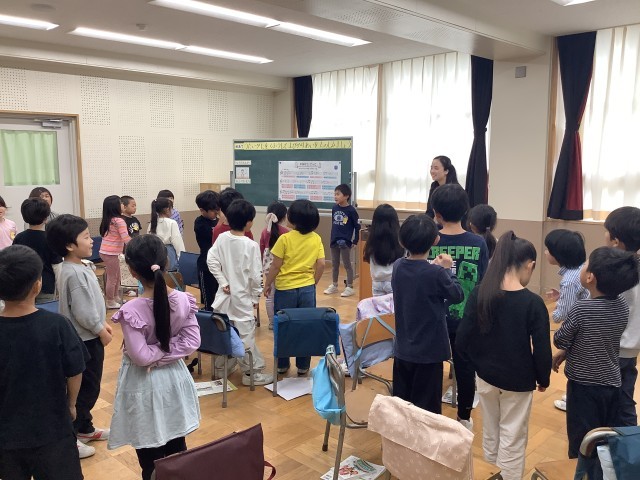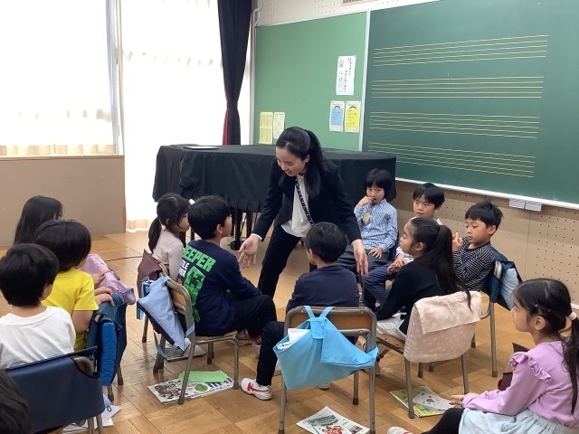 1年生の音楽の学習の様子です。今日は「せんりつで よびかけあおう」という題材で、「やまびこ ごっこ」の曲を教材として学習しました。グループごとに声の表情(怒った感じの声、滑らかな感じの声 など)を工夫しながら、歌うことの楽しさを感じていました。