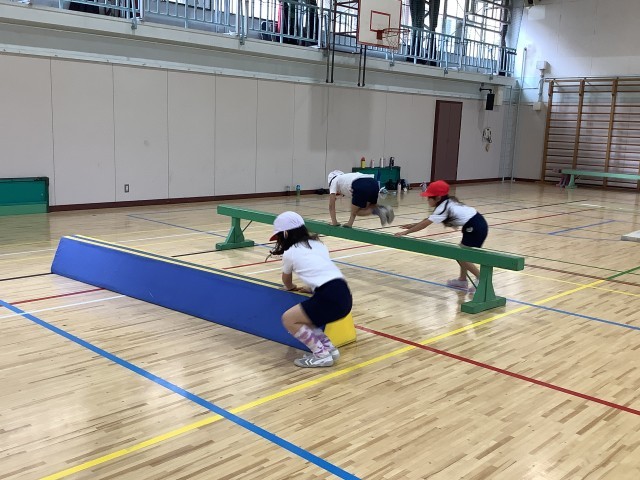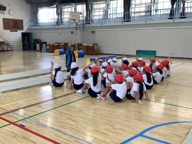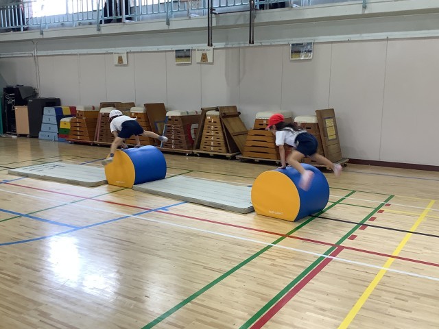 1年生の体育の学習の様子です。1年生は体育館での体育の学習では、「器械・器具を使っての運動遊び」として、マットや平均台、ソフト跳び箱などを用いた運動遊びをしています。マット上での前転がりや後ろ転がり、平均台を使っての川跳び、ソフト跳び箱を使ってのジャンプなど、様々な運動遊びに親しんでいます。