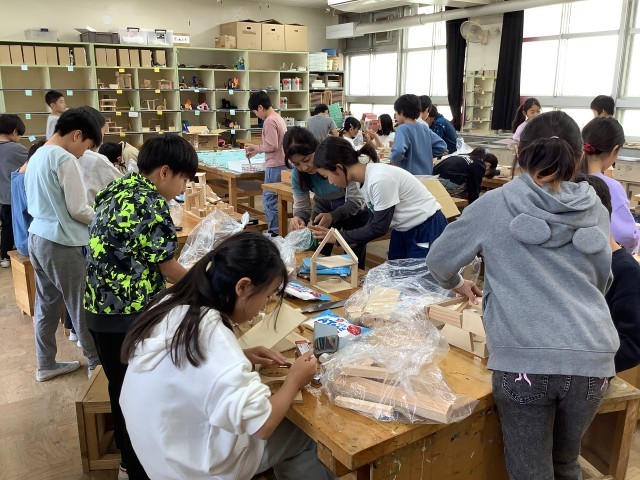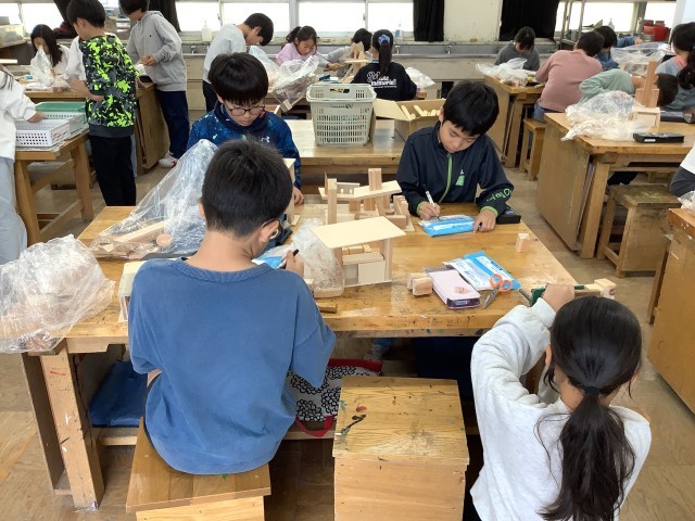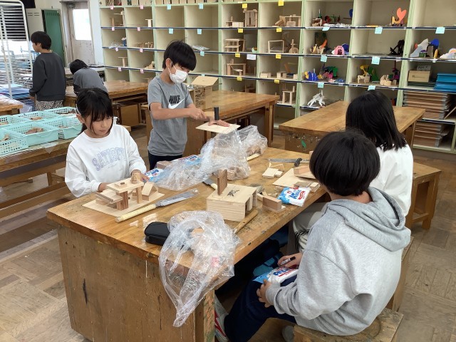 4年生の図工の学習の様子です。先週も紹介しましたが、4年生は「ひみつのすみか」という学習をしています。木材をのこぎりで切ったり、釘を打ったりする作業に、黙々と取り組む姿や友達と教え合いながら活動している姿が見られました。