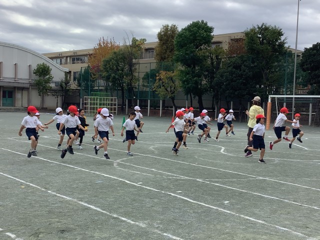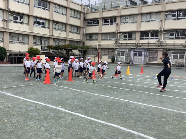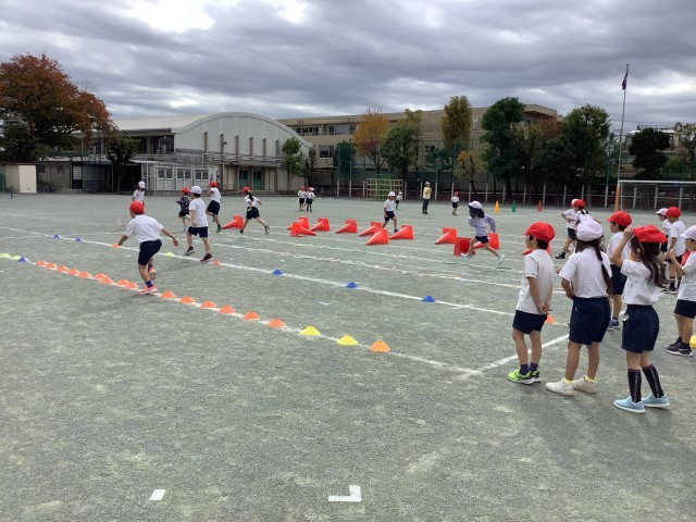 1年生の体育の学習の様子です。1年生の校庭での体育は今、「走の運動遊び」の学習をしています。直線を様々な動きで走ったり、蛇行したコースを走ったり、いろいろな障害物をリズムよく越えて走ったり、楽しく運動に取り組んでいました。