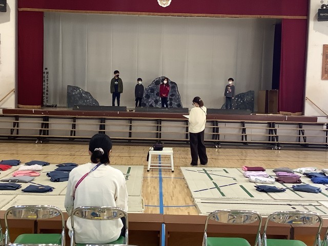 昨日から「学習発表会」の特別時間割が始まっています。写真は2年生の劇の、体育館での練習の様子です。2年生は今日から、1学級が学級閉鎖となってしまっていますが、学級閉鎖中の子たちが安心して登校できるよう、登校している子たちで頑張って練習を進めていました。