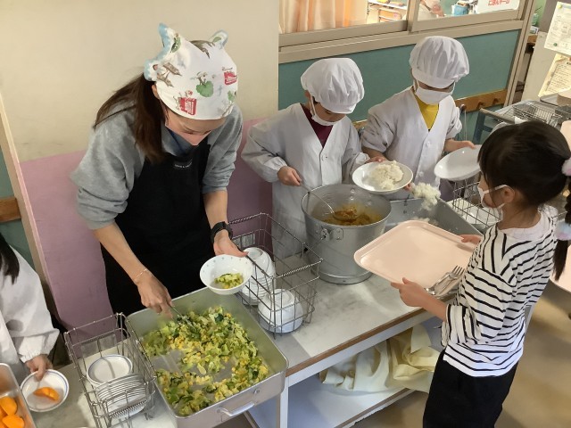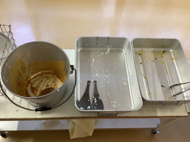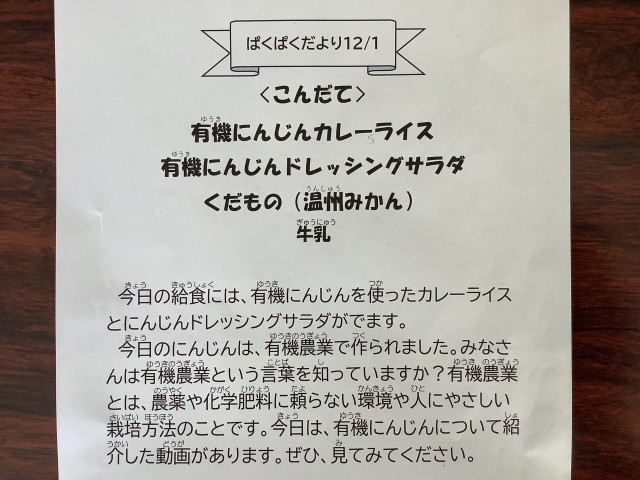 今日の給食のメニューは、有機にんじんを使ったカレーライスや有機にんじんドレッシングサラダでした。子どもたちは、有機野菜について紹介した動画も視聴しました。みんなおいしくいただき、多くの学級で、配膳後の食缶は、空の状態でした。