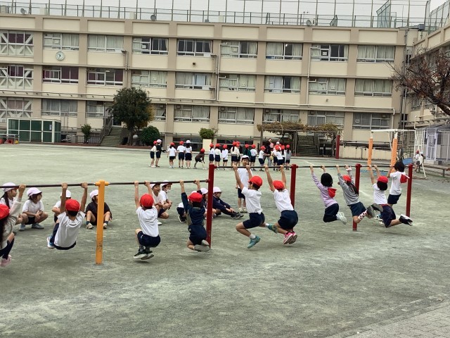1年生の体育の学習の様子です。今日は少し寒かったですが、全学級が元気に、校庭で運動しました。今日は、長縄跳びや短縄跳び、鉄棒を行いました。授業の後の手洗いやうがいも忘れないようにして、健康には気を付けながら、頑張っていました。