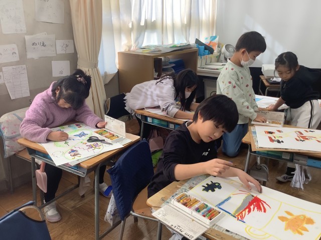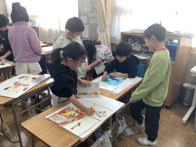 2年生の図工の学習の様子です。2年生は今、「お話から生まれたよ」という学習で、「100階建ての家」の絵本を読み聞かせた後に、自分たちでもオリジナルの家を想像して、友達と協力しながら絵に表現する学習をしました。
