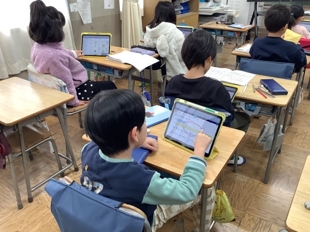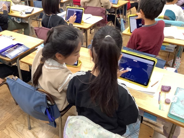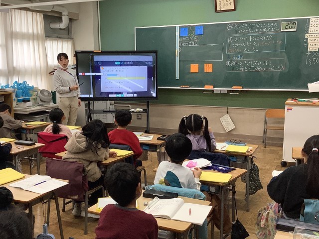 2年生の算数の学習の様子です。等分の意味を考えながら「分数」の学習をしました。先日配布した新しい学習用情報端末を上手に使いこなしながら、1人で、ペアで、全体で、学習を進めています。