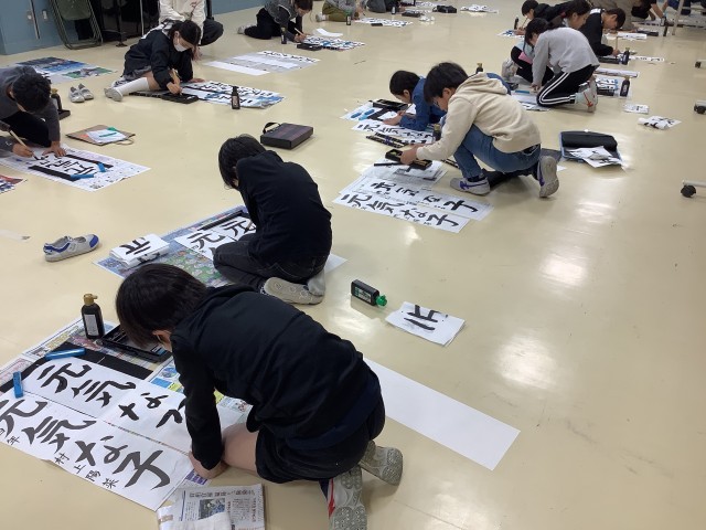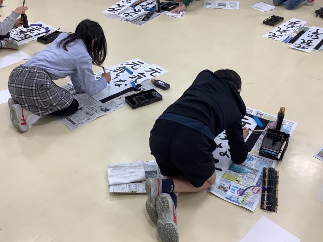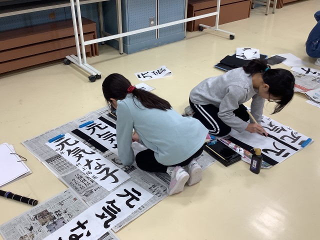 4年生の書写の学習の様子です。4年生は書き初めで「元気な子」という文字に挑戦します。学校での席書会は体育館で行いますが、今日は多目的室で練習しました。はねが何ヶ所かあり難しいですが、一字一字丁寧に、一生懸命練習に取り組んでいました。