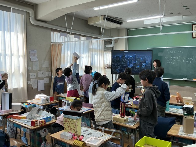 2年生の図工の学習の様子です。2年生は今、「ともだちハウス」という学習をしています。持参した様々な形や大きさの空き箱を、想像力を生かして積み重ね、オリジナルの小さな友達が喜びそうな家を、楽しいながら制作していました。