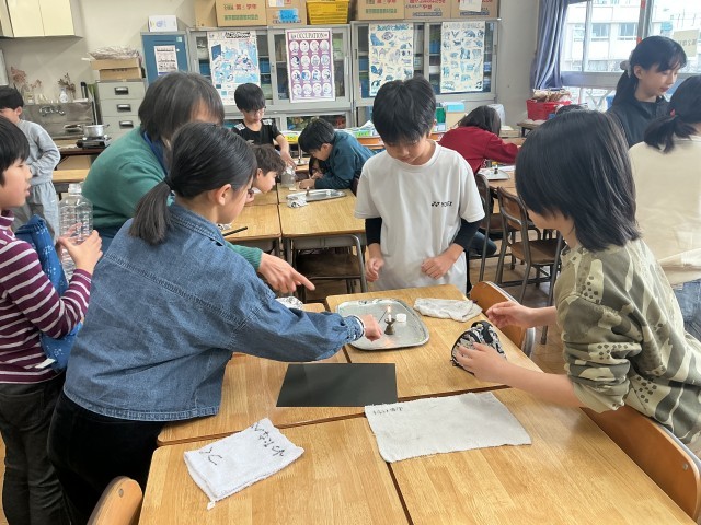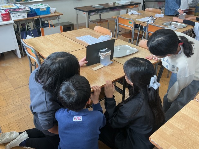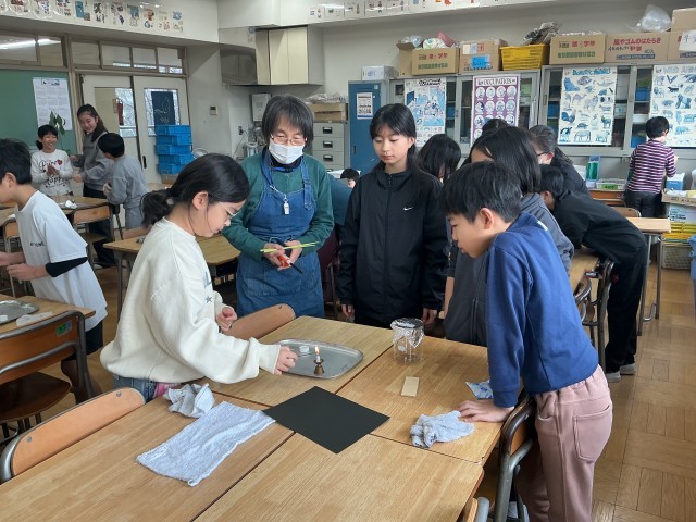 4年生の理科の学習の様子です。今日は「空気はどのようにして温まるだろうか」という課題に対して、ビーカーの中にお線香の煙をためて、空気の温まり方を確認する実験を行いました。声を掛け合い、安全には気を付けながら、実験を進めることができました。