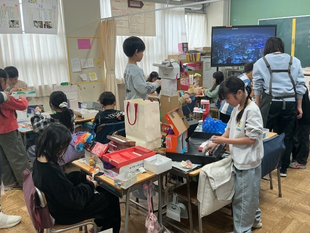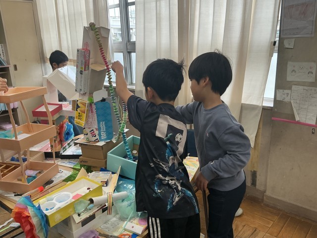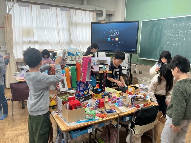 2年生の図工の学習の様子です。2年生は今、「ともだちハウス」という学習をしています。先々週にも紹介しましたが、随分と「ともだちハウス」が出来上がってきました。友達と協力し合ったり、紹介し合ったりしながら、楽しく活動に取り組んでいました。