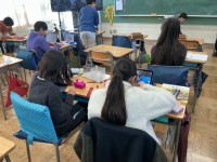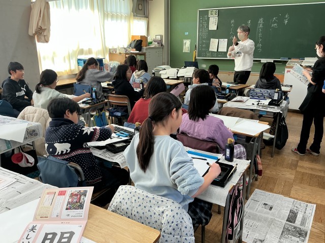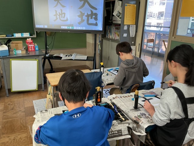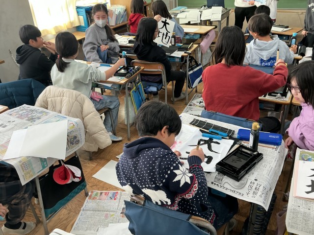 4年生の書写の学習の様子です。1・2年生は硬筆、3年生以上は毛筆で、年間を通して計画的に学習をしています。今日は「大地」という文字を書きました。はねやはらいが難しい文字ではありますが、集中して取り組んでいる子が多かったです。私も子どもたちと一緒に書いてみましたが、かなり難しかったです…。