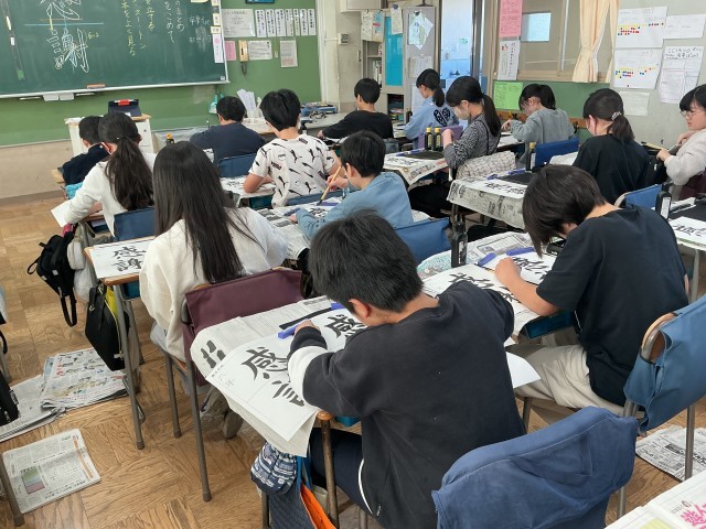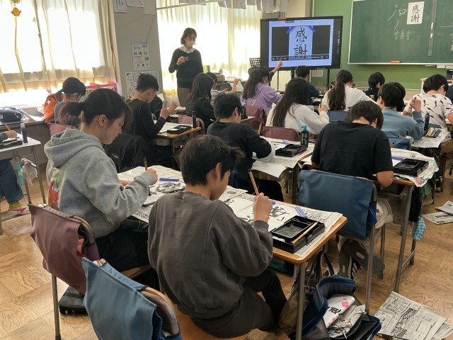 6年生の書写の学習の様子です。1・2年生は硬筆、3年生以上は毛筆で、年間を通して計画的に学習をしています。今日は「感謝」という文字を書きました。画数の多い、難しい文字ではありますが、6年間の思いを込めて、集中して取り組んでいました。