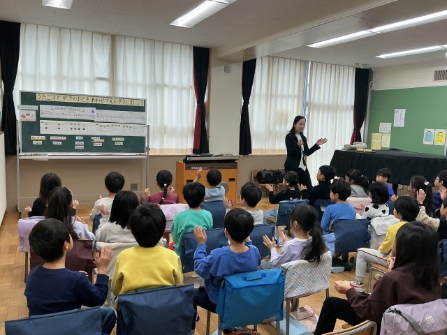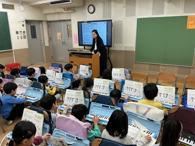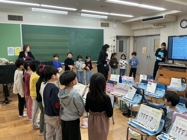 1年生の音楽の学習の様子です。今日は「うたごえとがっきのおとをあわせて えんそうしましょう」というねらいで学習しました。歌にタンブリンやトライアングル、鍵盤ハーモニカなどの楽器を重ねて、声と音のコントラストを楽しみながら学習していました。