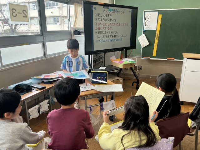 2年生の生活科の学習の様子です。「あしたへジャンプ」という学習として、自分ができるようになったと思うことを、紙や動画にまとめました。聞き手に分かりやすいように、大きな声で、ゆっくり、はっきり発表できるよう、練習をしました。