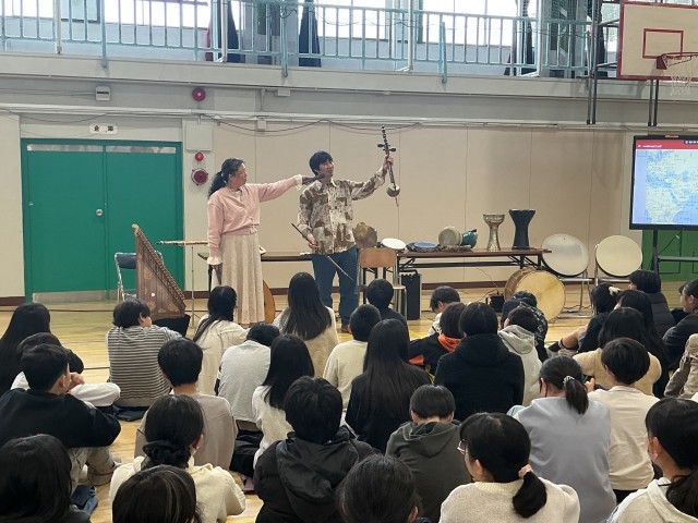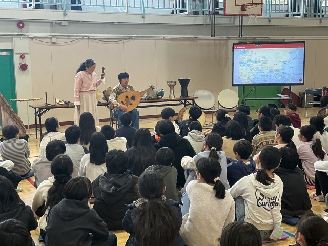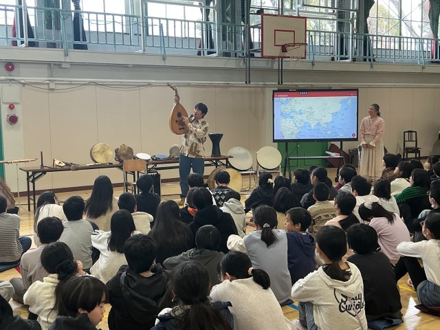 6年生の「音楽の花束」の学習の様子です。先週は和楽器体験ワークショップの学習で、琴や三味線、小鼓などの楽器を体験いたしましたが、今日は世界の打楽器や絃楽器の歴史を学んだり、音色の違いを楽しんだりしました。卒業を前に、多くの楽器に触れる機会を設定しています。