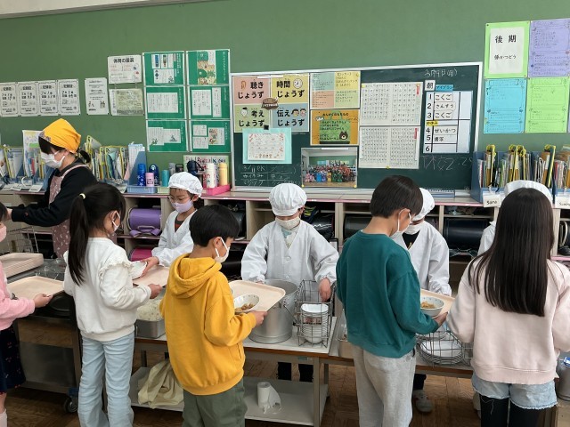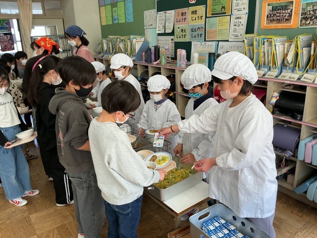 3/5(木)は「6年2組献立」でしたが、今日は「6年3組献立」です。前回も紹介したように、6年生が家庭科の時間に、いろいろと考えて決めた献立を、給食で提供したものです。給食準備をしているのは、2年生です。手際よく配膳していました。