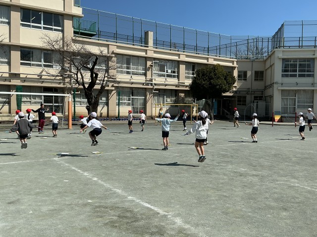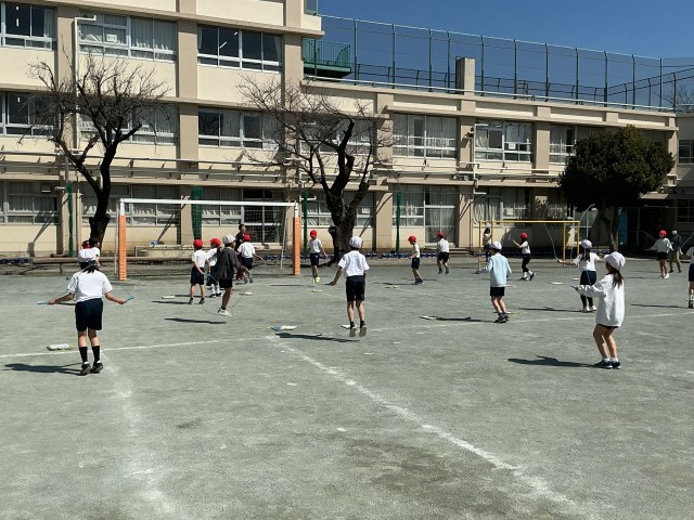 2年生の体育の学習の様子です。写真は「体つくり運動」の中の用具を操作する運動遊びとして、短縄跳びをしている様子です。縄跳びweekや休み時間などにも取り組んできた短縄跳びなので、子どもたちもずいぶんリズミカルに跳ぶことができるようになってきました。