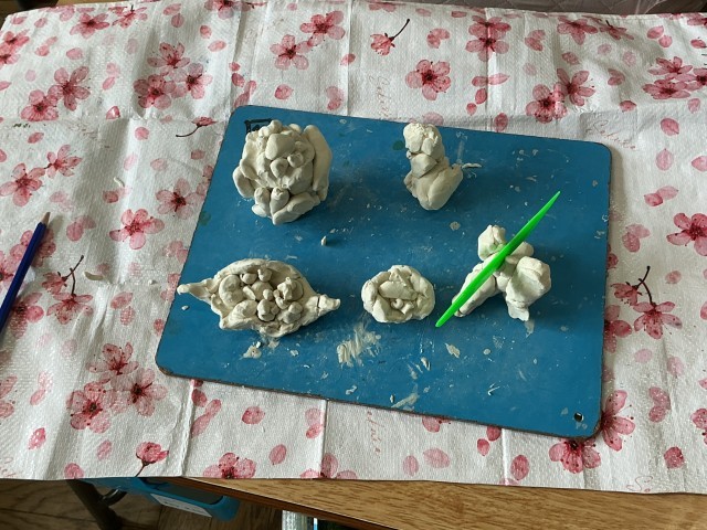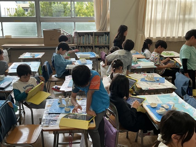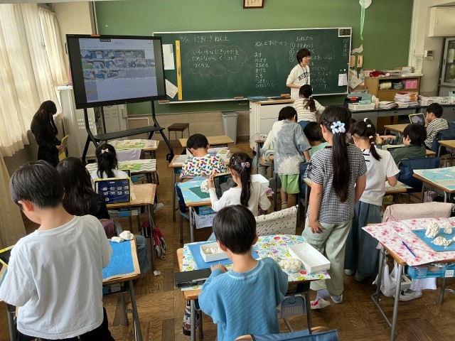 2年生の図工の学習の様子です。今日は「にぎにぎねんど」という学習をしました。粘土を握って、いろいろな形を作ったり、自分が作った作品を学習用情報端末を活用しながら、鑑賞し合ったりしました。写真のような芸術的な作品がたくさん生まれました。