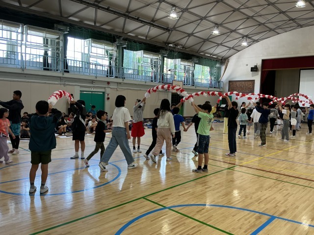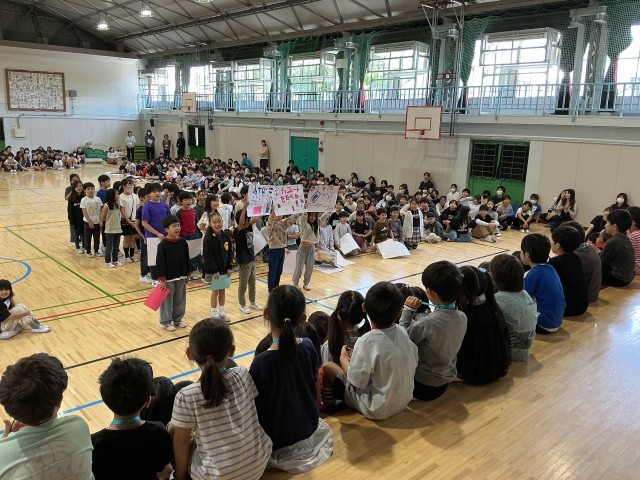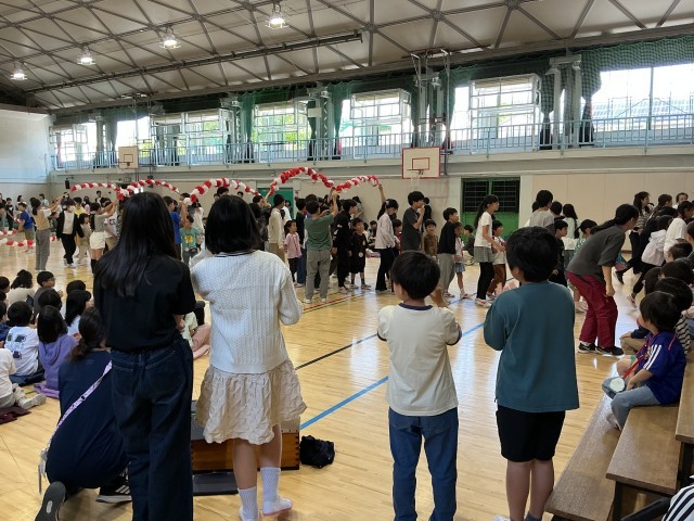 今日は、2時間目に「1年生を迎える会」を行いました。1年生にとっては、本校の一員になったことを実感し、より一層仲よく、楽しく学校生活を送っていくための意欲を高めることができる行事です。写真は5年生が作成した花のアーチを、6年生と手を繋いで入場する様子と、3年生が出し物でクイズをしてくれている様子です。