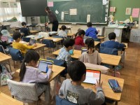 1年生の学習の様子です。国語では、花のつぼみの学習を生かして、タブレットを活用しながら「つぼみクイズ大会」の準備をしたり、算数では、たし算の仕方を考えたりしています。