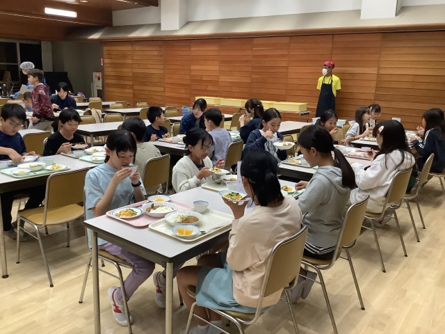 宿舎では、開園式で管理人さんからお話をいただいたり、夕食で美味しいカレーを食べたり、キャンプファイヤーをしたりしました。食事係やレク係の子も、とても一生懸命仕事をしていました。