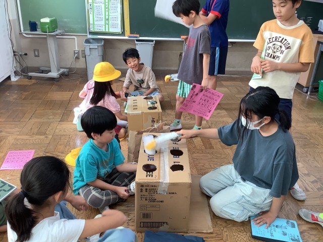 全校フェスティバルでは、各班が工夫したお店を出して、お客さんも自分たちも楽しんでいました。「おさかなハンター」や「桃太郎キャッチ」、「中目ジャングル脱出ゲーム」など、お店の名前も工夫し、楽しい半日を過ごすことができました。