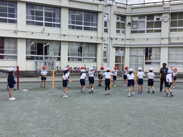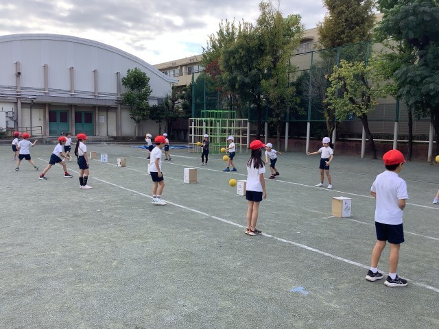 2年生の体育の学習の様子です。2年生はローテーションで、「器械・器具を使っての運動遊び」として、鉄棒を使った運動遊びやマットを使った運動遊び、ボールゲームなどの学習をしています。