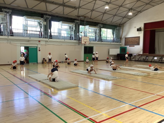 1年生の体育の学習の様子です。1年生は体育館での体育の学習では、「器械・器具を使っての運動遊び」として、マットや平均台、ソフト跳び箱などを用いた運動遊びをしています。マット上での前転がりや後ろ転がり、平均台を使っての川跳び、ソフト跳び箱を使ってのジャンプなど、様々な運動遊びに親しんでいます。