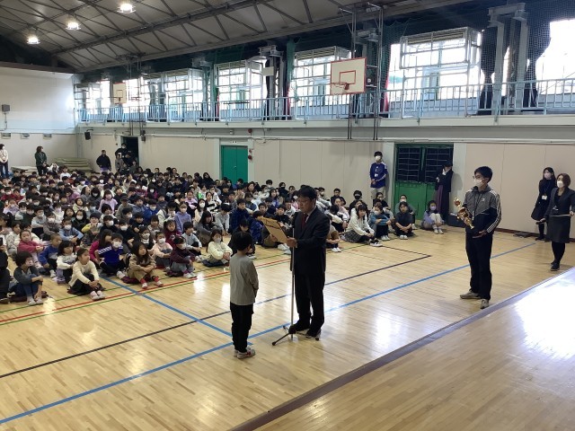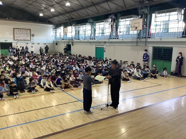 今日は、月に1回の全校(表彰)朝会がありました。校長からは、学習発表会で頑張った話や、冬休みまでしっかりと落ち着いて生活をするよう呼びかけました。また、表彰では、ピアノコンクールや空手で優秀な成績を収めた子たちを表彰しました。