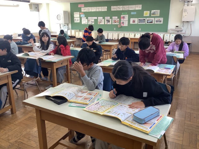 5年生の書写の学習の様子です。書き初めでは「平和の光」という文字に挑戦しますが、今日は「成長」という文字を書きました。はねやはらいが難しい文字ではありますが、お手本をしっかりと見ながら、気持ちを集中させて、文字に向き合っていました。