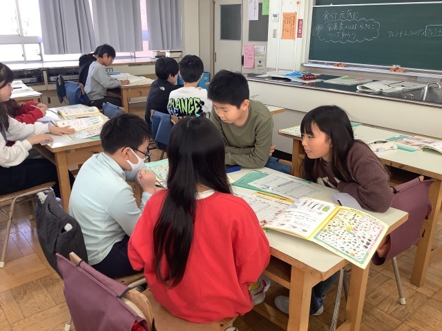 5年生の家庭科の学習の様子です。写真は1組です。1組は、自分でしっかりと調べたり、友達と相談したりしながら、献立の材料を6つの食品群に分類する学習をしました。今回の学習を経て、来週は調理実習を行います。
