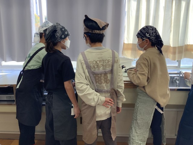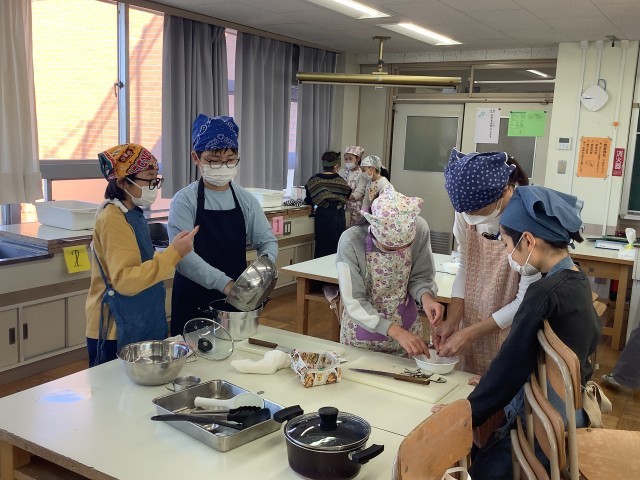 5年生の家庭科の学習の様子です。写真は2組です。2組は、調理実習として、グループごとに、ごはん、みそ汁、ナムルを作りました。しっかりと役割分担をして、声を掛け合いながら、協力し合って調理自習に取り組んでいました。