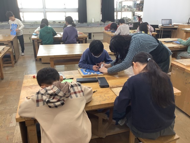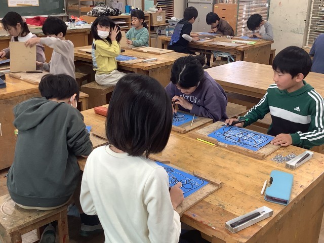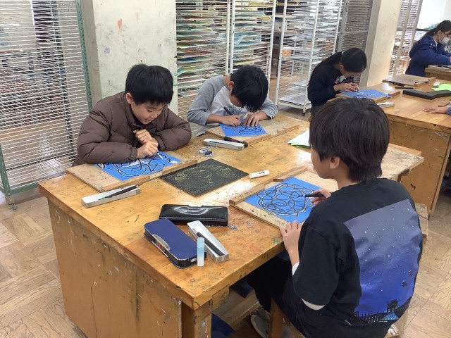 4年生の図工の学習の様子です。2年生は今、「線から生まれた模様」という学習で、版画の学習をしています。今日は、自分が描いた模様の線を、安全面に気を付けながら、丁寧に彫り進めていました。