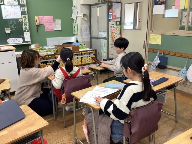 4年生の算数の学習の様子です。当然ですが、冬休み直前の最終日も、どの学年も一生懸命学習しています。4年生は今日はそろばんの学習をしました。習っている子もいるようですが、普段はあまり使い慣れない子が多いそろばんです。みんな一生懸命学んでいました。