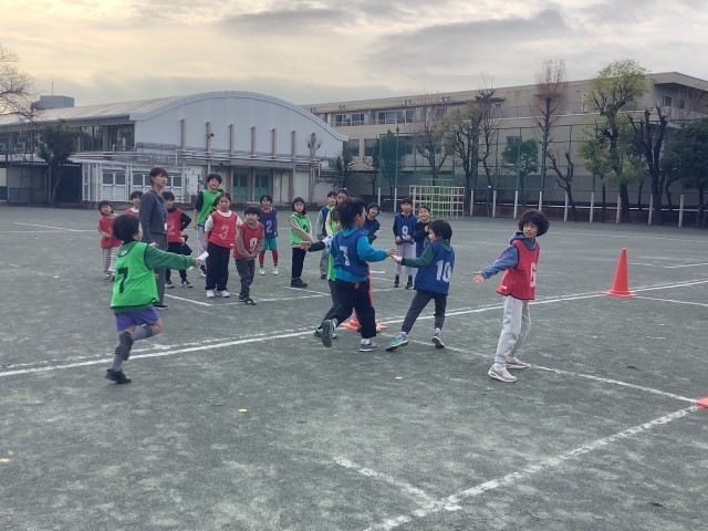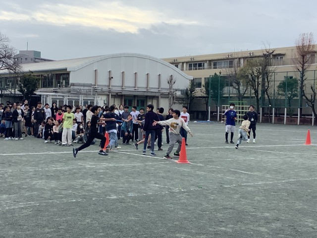 今日は後期前半の最終日ということで、多くの学級や学年で「お楽しみ会」を行っていました。写真は6年生の様子です。6年生は合同で、校庭でドロケイをしたり、学年全体リレーを行ったりしました。楽しそうに活動していました。