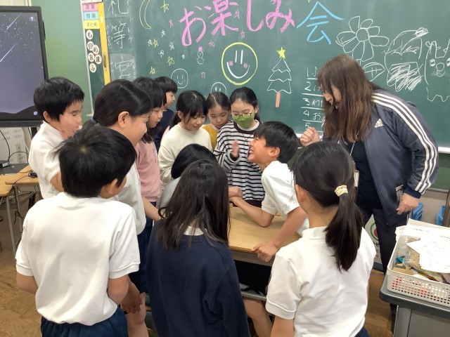 今日は後期前半の最終日ということで、多くの学級や学年で、「お楽しみ会」を行っていました。写真は3年生の様子です。3年生は、学級ごとに校庭でリレーをしたり、教室で腕相撲大会を行ったりしました。楽しそうに活動していました。