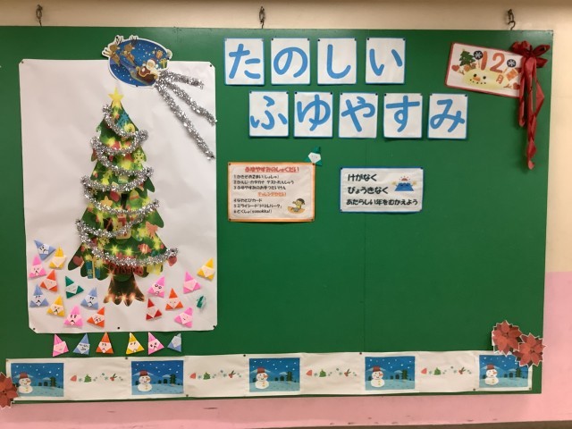 今日で後期前半が終了いたします。子どもたちは、日々の学習や生活、様々な行事など、本当によく頑張りました。明日から冬季休業日となりますが、この1年間をしっかりと振り返り、新たな気持ちで新年を迎えられればと思います。体調には気を付けて、元気に過ごしてください。