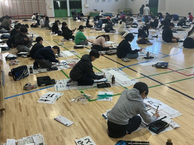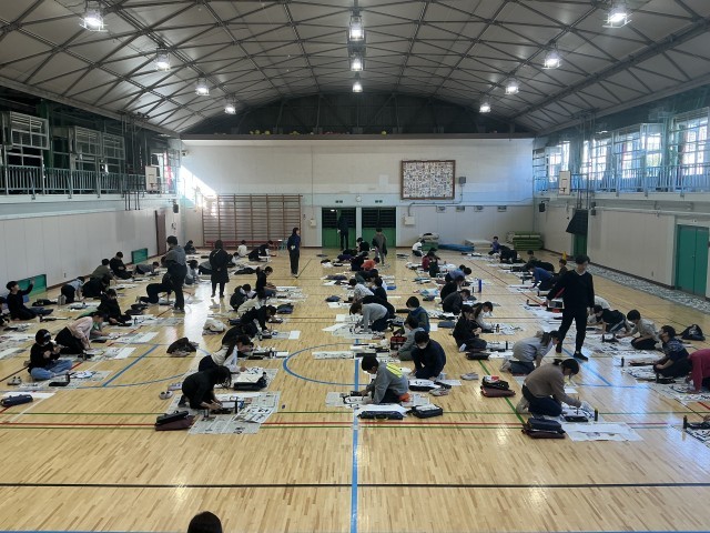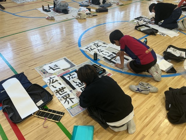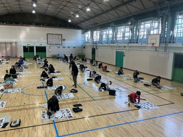 令和8年、新しい年を迎え、学校では先週から席書会を行っています。写真は5年生の様子です。5年生は「広い世界」という文字を書きました。冬休みに練習してきた成果を生かして、はねやはらいに気を付けながら、1文字1文字丁寧に書くことができました。