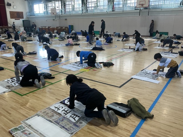 令和8年、新しい年を迎え、学校では先週から席書会を行っています。写真は3年生の様子です。3年生は「お正月」という文字を書きました。冬休みに練習してきた成果を生かして、みんな集中して書くことができました。