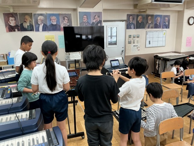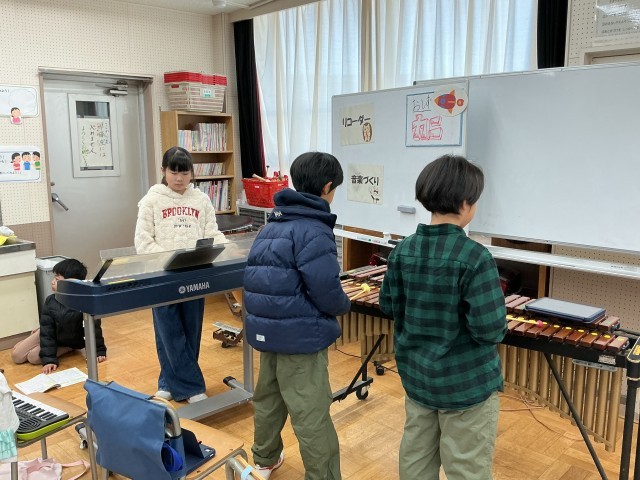4年生の音楽の学習の様子です。4年生は今、「豊かな響きを味わいながら演奏しよう」というめあてで、色々な楽器の演奏を楽しんでいます。1人で楽しんだり、友達と異なる楽器の音を合わせて楽しんだりしていました。