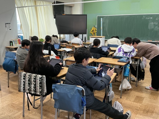 6年生の総合的な学習の時間の学習の様子です。6年生は今、「未来の社会と将来の私」という学習をしています。未来に思いを馳せ、未来の社会の職業について調べたり、自分の将来について真剣に考えたりしています。