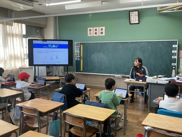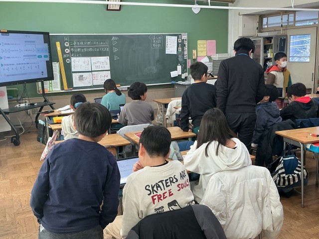 4年生の算数の学習の様子です。今日は「分数」の学習をしました。帯分数と仮分数の表し方を学ぶ学習として、数直線を活用したりしながら、一生懸命学習していました。3年生以上の算数では、基本的には少人数指導を展開していますが、今日も少人数グループに分かれて学習しました。