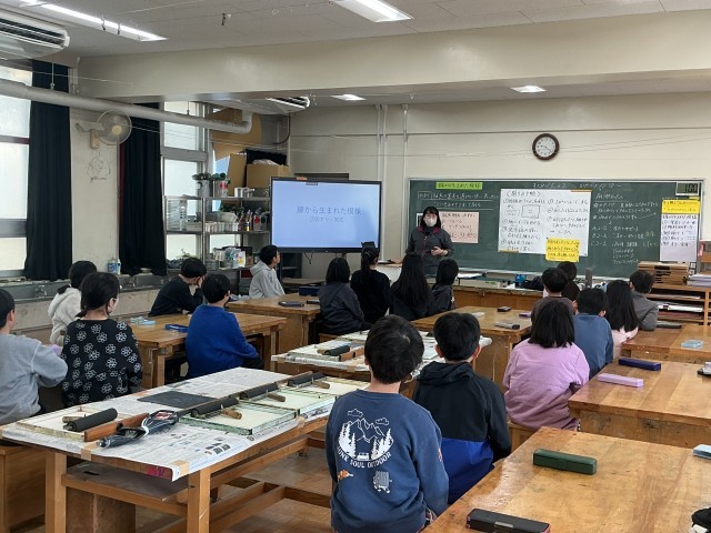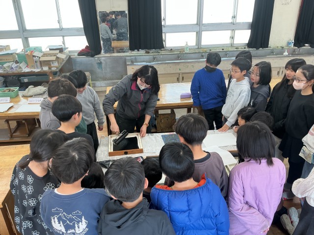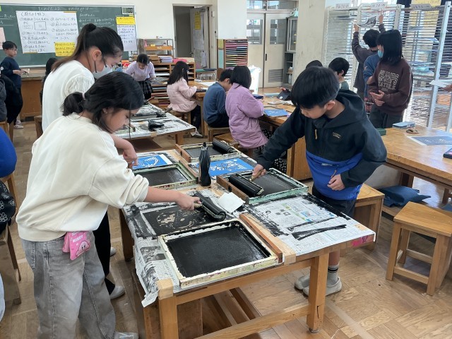 4年生の図工の学習の様子です。4年生は今、「線から生まれた模様」という版画の学習をしています。今日は「版画の道具を適切に使い、表したいことにあわせて工夫して刷る」というめあてで学習しました。ステキな作品がたくさん生まれていました。