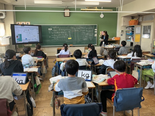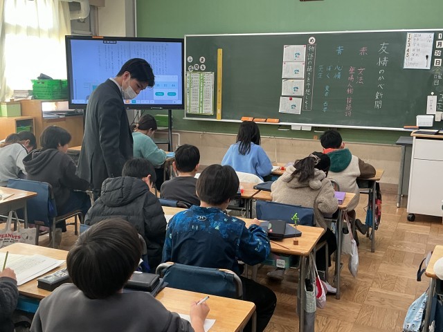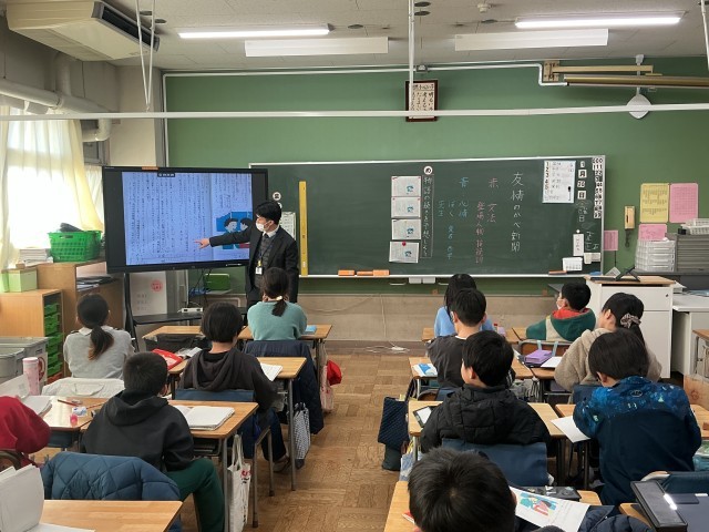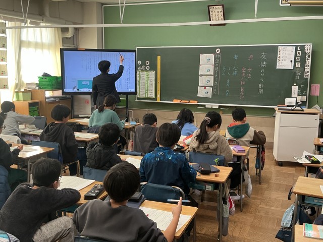 4年生の国語の学習の様子です。4年生は今、「友情のかべ新聞」という教材を使って学習を進めています。物語の全文を示さず、少しずつ提示していく手法を用いて、「物語の続きを読み、推理しよう」というめあてで学習に取り組みました。