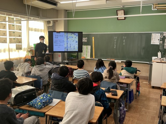 今朝は全学級で安全指導を行いました。この安全指導は、実際に避難をする毎月の避難訓練と、いざという時にどう対応するかを教室で学ぶ安全指導とをリンクさせることで、より安全な避難方法を知る意味も込めて行っています。今日は「Jアラート発令時」の対応の仕方を学びました。