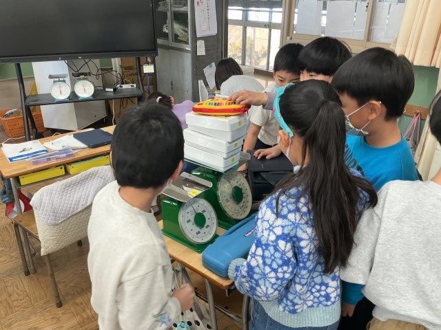 3年生の算数の学習の様子です。今日は「重さ」の学習をしました。実際にランドセルや粘土など、身の回りにあるの物の重さを測ったり、重さの単位について学習したりしました。実際に重さを測る場面では、意外に重かったり軽かったりすることを知り、驚きの声をあげている場面もありました。