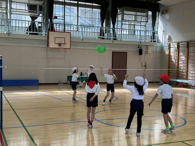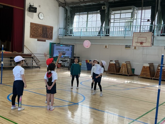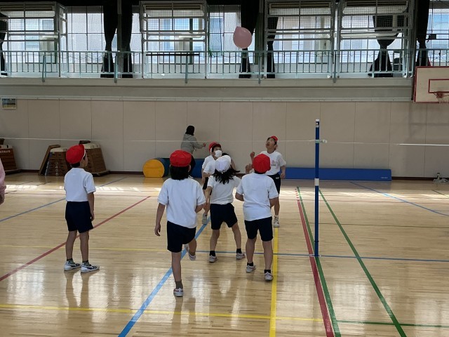 1年生の体育の学習の様子です。今日は「ゲーム」のボールゲームとして、簡単なルールでの風船バレーボールをしました。みんな歓声をあげながら、楽しそうに運動に取り組んでいました。