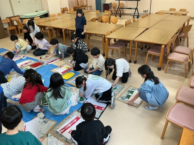 2年生の図工の学習の様子です。今日は「たのしく うつして」という学習をしました。まずは教室で、紙を好きな形に切った後、ランチルームでローラーを使って版画のように、紙にうつしてみました。友達と見せ合ったり、教え合ったりしながら、作品作りを楽しんでいました。