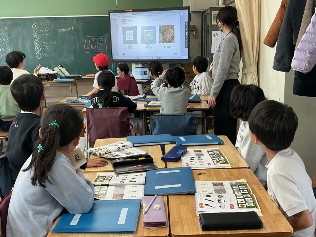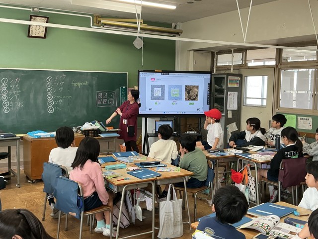 3年生の外国語活動の学習の様子です。3年生は外国語の講師の先生を中心に、アクティビティも取り入れながら、楽しく学習しています。今日は形の名称や動物の名前などを、クイズも入れながら学んでいました。