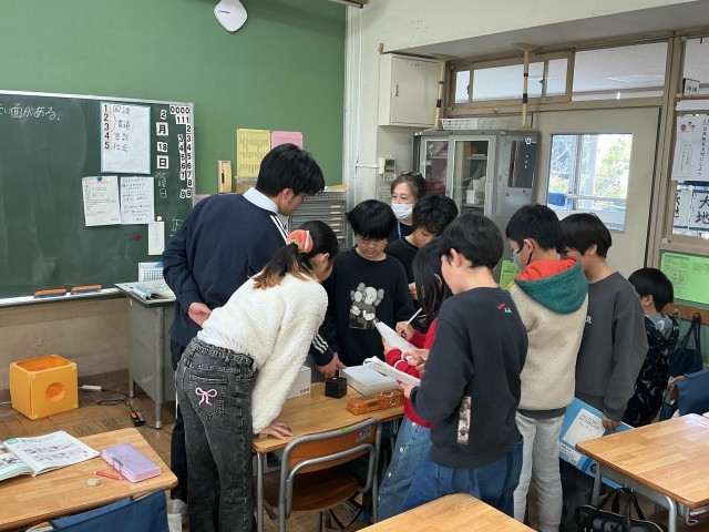 5年生の理科の学習の様子です。今日は「ふりこのはたらき」の学習をしました。教室に実験器具を持ってきて、おもりの重さによって、振れ幅や時間はどのように変化するのかという実験をしました。グループで役割分担をして、声を掛け合いながら、実験に取り組んでいました。